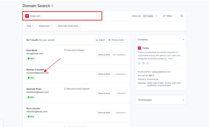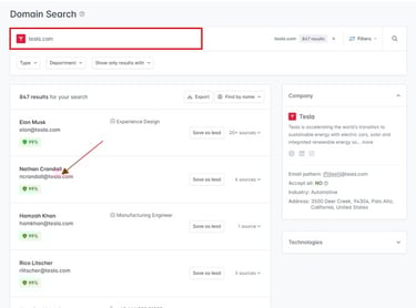 Let's get some juicy information, such as employee emails from the Tesla staff. There are several ways to do this, but here we're utilizing the hunter.io app.